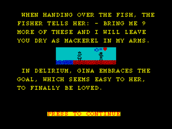 To win Libório’s heart, Gina must collect and deliver dried mackerel located on the opposite side of the ravine. To do so, she must jump into the ravine, where the fall is softened by her skirt, landing safely on a boat below. After collecting the fish, Libório throws down a rope from the edge of the ravine, which Gina can only reach from the ship. His heart is only fully won after delivering ten dried mackerel.
