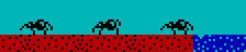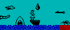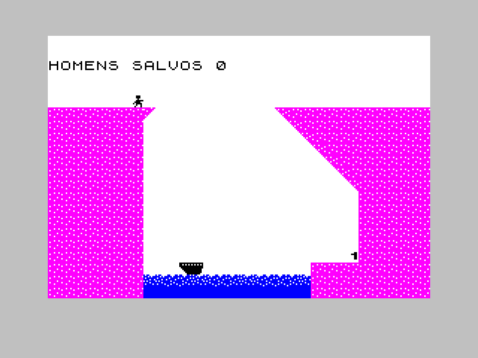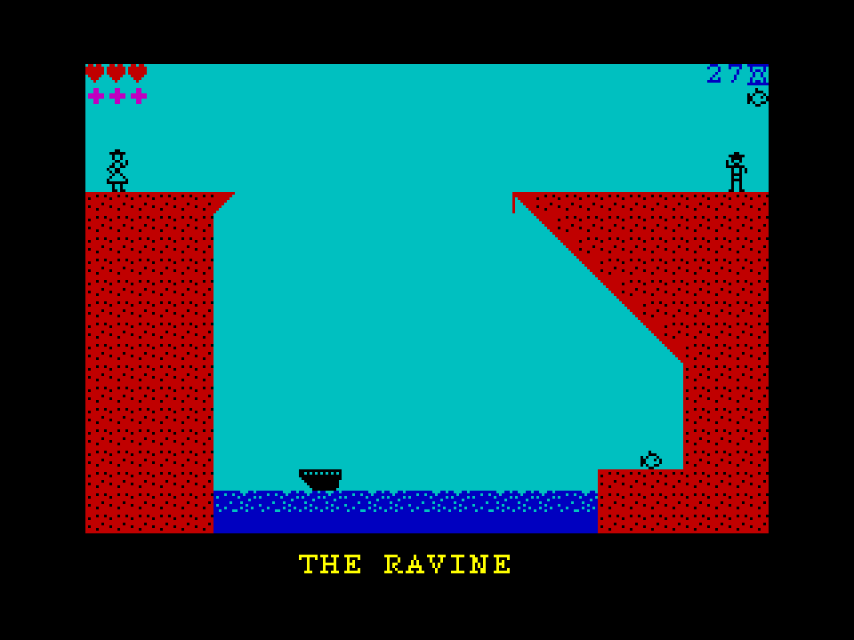 In the original Ravina, the gameplay was very simple, with a single-screen layout. The player had to descend into the ravine to reach a boat, jump to the opposite bank, and collect a jet pack. After returning to the boat, the player would wait until it was positioned below the opposite side of the ravine from where the game started, and then activate the jet pack to complete the objective. The controls are: 5 - go left, 6 - go down, 7 - go up, and 8 - go right.